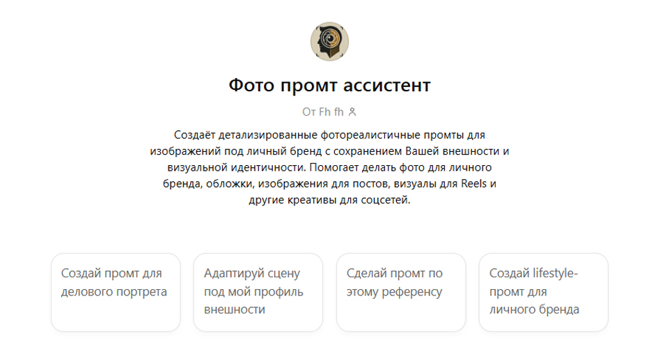 Помогает создавать точные фотореалистичные промты для изображений под личный бренд. Подходит для фото, обложек, визуалов для постов, Reels и других материалов для соцсетей. Сохраняет Вашу внешность, адаптирует сцену под Вас и помогает получать более стабильный результат в генерации.
