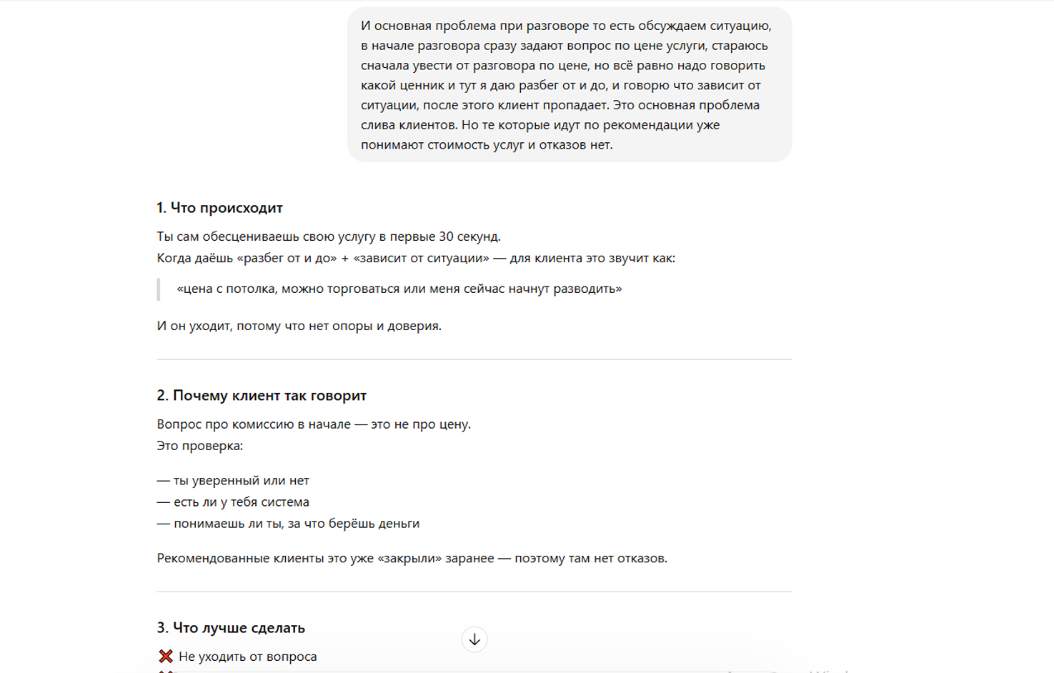 Соберёте ИИ ассистента, который помогает аргументированно подводить собственника к рыночной цене, так что бы он сам приходил к нужному решению без давления и конфликтов.