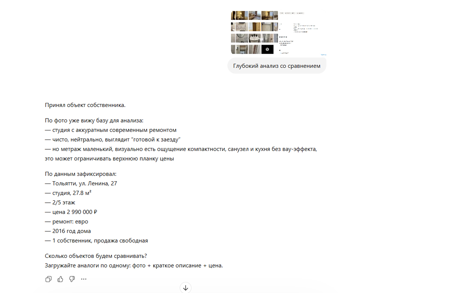 Результат: Готовый персональный ассистент с которым собственники легче соглашаются на корректировку цены и вы не теряете объект из-за конфликта.